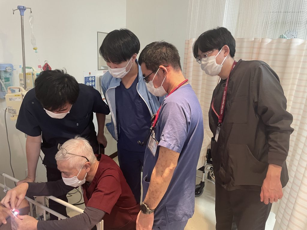 教育回診の症例は「アルコール多飲歴のある中年男性の嘔気、意識障害」で、診断としては左皮質下出血(背景に肝硬変による出血傾向あり)、低ナトリウム血症でした。こちらの病院ではこれまでの病院と異なりベッドサイドでの教育回診も実施されました。その場では身体診察のとり方やその指導風景を勉強させていただき、医学教育においてベッドサイド教育が非常に重要ということを改めて実感しました。自身が人に教えることができるように改めて問診・身体診察について丁寧に行なっていこうと思いました。