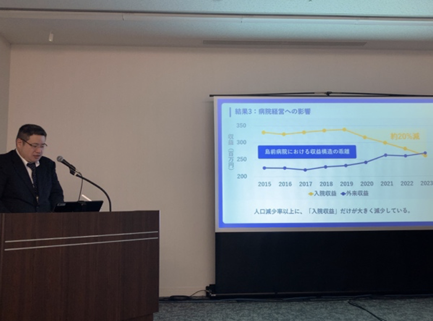 ネクストバッターは堀内大輔さん。演題は、「離島病院における島外介護流出が病院経営に与える経時的変化:島根県隠岐諸島の比較」でした。島外への介護流出が問題となっている隠岐島前地域において、地域の主要医療機関である隠岐島前病院病床稼働率が低下し、入院機能の低下が起こっている現状に対して、介護流出との関連性を探るものでした。発表後の質疑応答では、介護流出が発生するメカニズムや、本テーマについてのさらなる探索の方向性について、フロアとの活発な意見交換がありました。